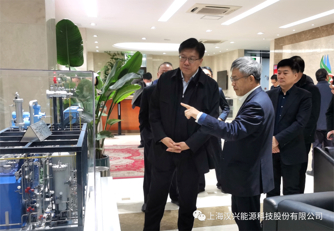 在设备模型展示区参观时,纪志愿向于书记等来宾详细介绍了公司着眼解决氢能发展运输环节成本过高问题而投入研发的移动撬装式制氢设备。