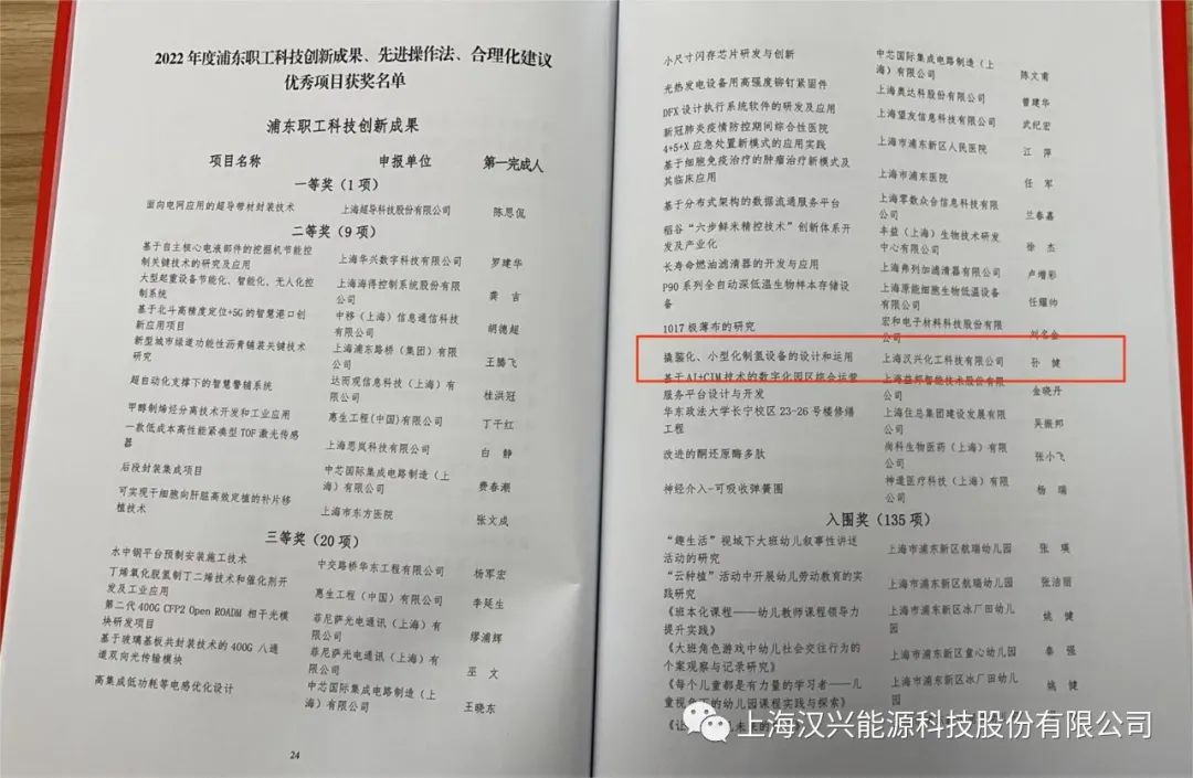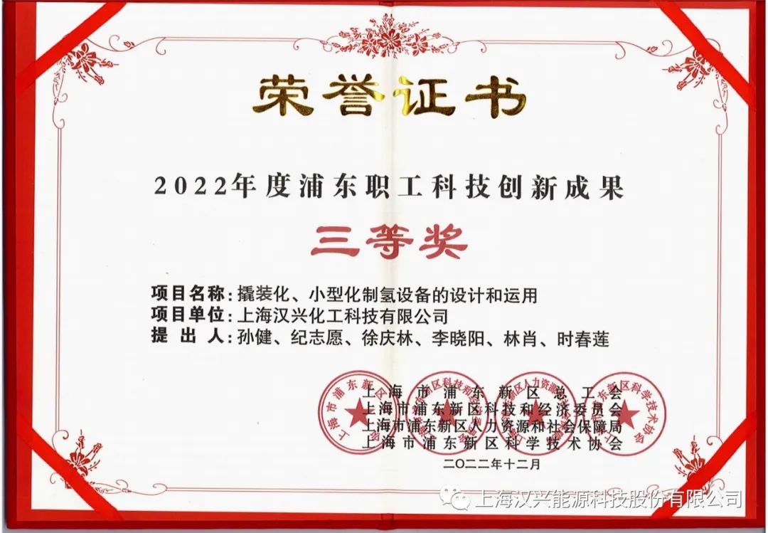 由纪志愿、孙健主持的“撬装化、小型化制氢设备的设计和运用”项目荣获2022年度浦东职工科技创新成果三等奖。