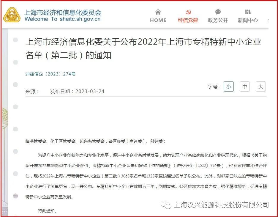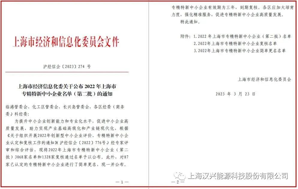 这是继2022年8月,汉兴能源旗下上海汉兴化工科技有限公司获评上海市“专精特新”企业称号,2023年3月初,汉兴能源及旗下上海汉兴化工科技有限公司均获评“2022年上海市创新型中小企业”之后又一殊荣。体现了汉兴能源及子公司在基础领域深耕细作能力,更加充分体现出公司的专业化、精细化、特色化、新颖化的发展特征。本次获评“专精特新”的企业称号,意味着汉兴能源的技术实力、产品实力、业务能力、发展潜力等多方面的综合实力均获得了官方认证,同时也是对我们的一种激励和鞭策。