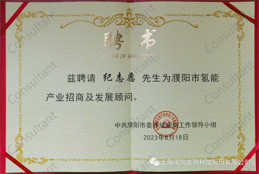 8月19日,纪志愿受邀到华龙区政府交流座谈,就战略合作达成初步意向。并受聘为濮阳“氢能产业招商及发展顾问”。