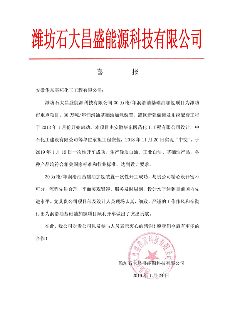 潍坊石大昌盛能源科技有限公司30万吨/年润滑油基础油加氢项目为潍坊市重点项目。由30万吨/年润滑油基础油加氢装置、15000Nm³/h甲醇制氢扩能改造装置、新建储运、消防、循环水、配电室等系统配套工程组成。于2019年1月19日一次性开车成功,并生产出合格的轻质白油、60N、100N、150N和350N润滑油基础油产品。